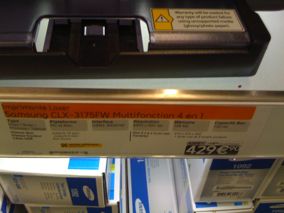 J’en avais assez de la qualité inégale de l’impression à jet d’encre (même si je pense qu’une grande partie des problèmes venait de l’utilisation de cartouches compatibles à bas prix), et de leur remplacement continuel, je suis donc passé à une laser et la moins chère multifonction et qui plus est couleur était la Samsung à 175,40 euros TTC avec livraison au rez-de-chaussée incluse pour environ 18 euros chez Pixmania.
