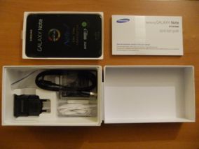 Le Galaxy Note, sa batterie amovible, le chargeur et son cable micro-USB standard, les écouteurs intra-auriculaires
